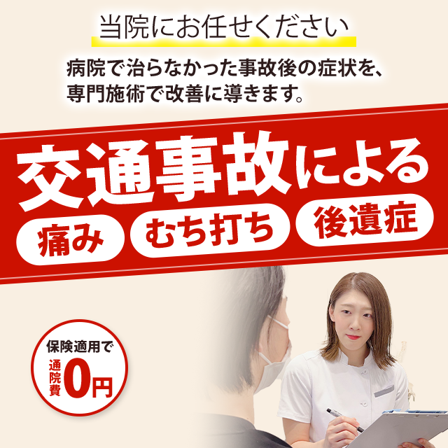 施術費は保険会社から支払われますので、ご来院者様の当院での窓口負担は原則0円です。